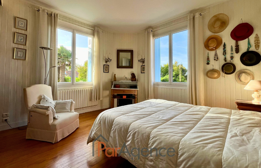 ROYAN à 400 m du marché central et 900 m de la plage de la Grande Conche, confortable maison des années 30, de 6 pièces principales pour 157m² habitables environ et comprenant : au rez-de-chaussée, entrée, cuisine équipée ouvrant sur terrasse et jardin, salle à manger, deux chambres dont une avec dressing, salle d'eau, w.c. A l'étage communiquant avec le rez-de-chaussée : deuxième entrée, salon, ouvrant sur balcon, dégagement, desservant deux autres chambres, salle d'eau et w.c., buanderie. Chauffage central au gaz de ville.En annexe un garage de 18.88 m² et une remise de 7.52 m² Le tout sur un terrain de 339 m². Les informations sur les risques auxquels ce bien est exposé sont disponibles sur le site Géorisques : www.georisques.gouv.fr. Prix 595400 EUR dont honoraires d'agence à la charge de l'acquéreur 4.% TTC soit 22900 EUR (572500 EUR hors honoraires). https://www.par-agence.fr/nos-honoraires.