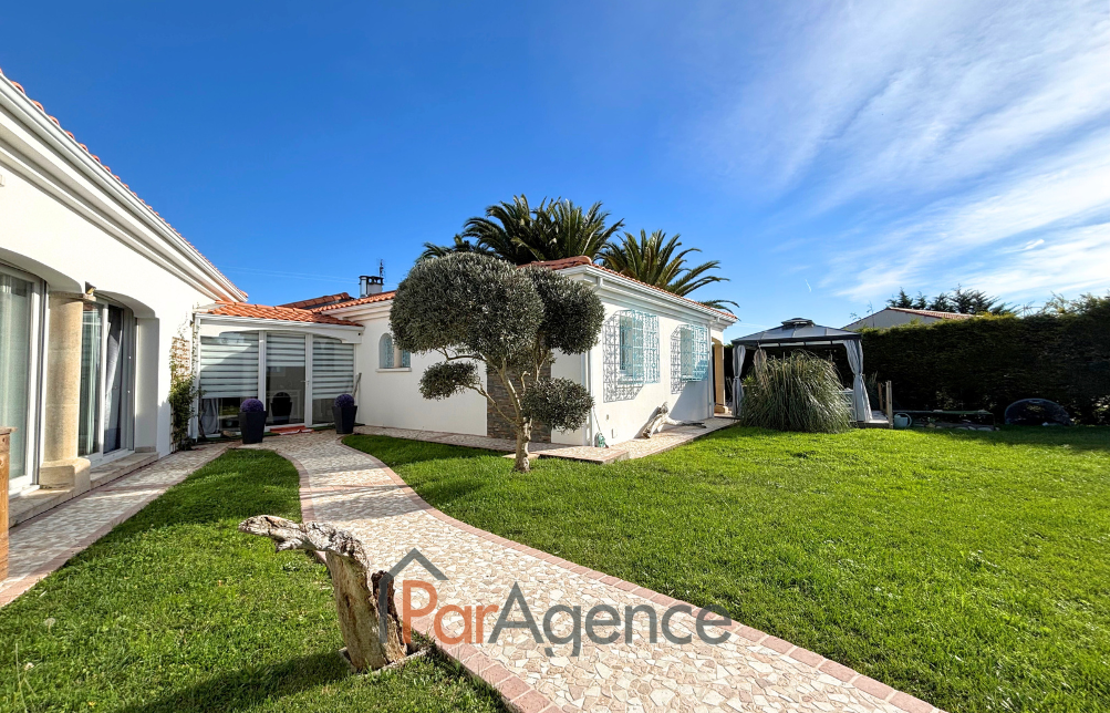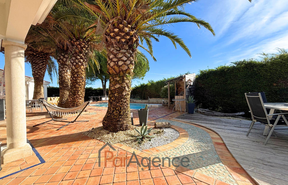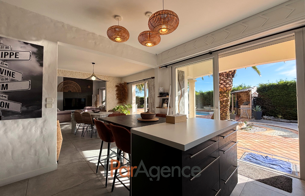 ROYAN 600 m commerces, belle villa en parfait état de 246 m² habitables environ comprenant : entrée, salon avec salle à manger attenante et cuisine à l'américaine équipée (65 m²) ouvrant sur terrasse et jardin avec vue sur la piscine, arrière-cuisine, suite parentale avec dressing et douche à l'italienne et baignoire, chambre avec placard, dressing, salle d'eau avec douche à l'italienne et placard, deux wc, chambre avec placard, grand bureau, une pièce, salle d'eau avec wc. Chauffage central gaz de ville au sol et radiateurs + poêle à bois. Garage avec galta et cave à vin. Abri de jardin. PISCINE CHAUFFEE 8X4. Le tout édifié sur un terrain entièrement clos de 1564 m². Les informations sur les risques auxquels ce bien est exposé sont disponibles sur le site Géorisques : www.georisques.gouv.fr. Prix 823 600 EUR dont honoraires d'agence à la charge de l'acquéreur 4 % soit 31 680EUR (792 000EUR hors honoraires). https://www.par-agence.fr/nos-honoraires.