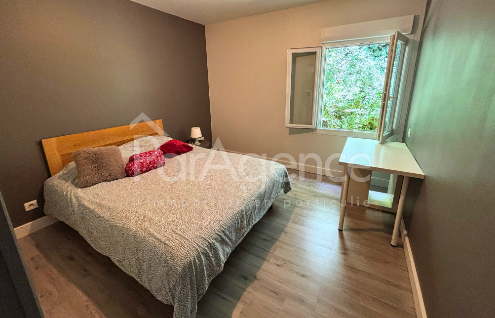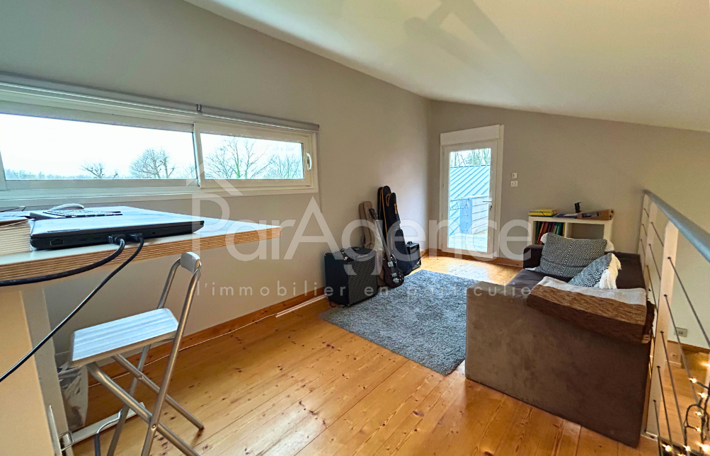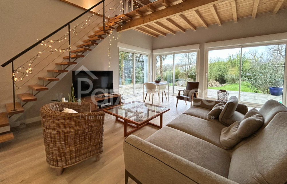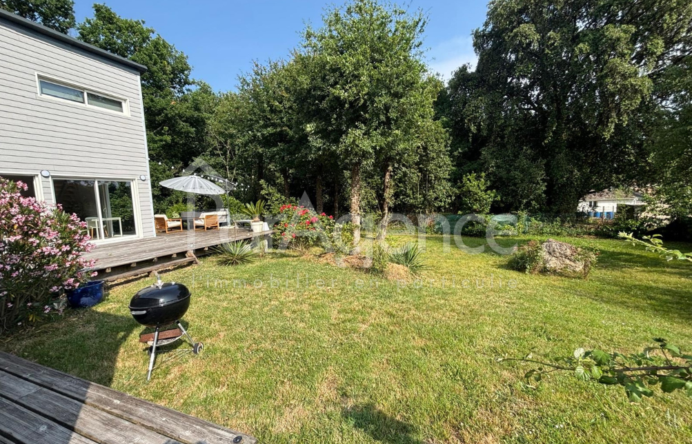 À Chaillevette, au coeur d'un environnement boisé préservé, cette maison contemporaine développe environ 158 m² habitables et offre un cadre de vie rare, tourné vers la nature et le calme. Le rez-de-chaussée accueille dès l'entrée, volumes et luminosités, avec une pièce à vivre ouverte sur une vaste terrasse de 70 m², véritable prolongement de l'espace de vie face à la forêt. En prolongement, un dégagement avec rangements dessert deux chambres, une salle de bains et des toilettes séparées, ainsi qu'une suite parentale composée d'un dressing et d'une salle d'eau avec WC. Un bureau et un cellier complètent ce niveau, répondant aux besoins du quotidien et du télétravail. À l'étage, une mezzanine ouverte mène à une seconde terrasse de 20 m², offrant une vue dégagée sur la nature ce qui apporte une atmosphère paisible. Le confort est assuré par un chauffage au sol, alimenté par une chaudière électrique. Un garage de 43 m² avec double portes motorisées ainsi qu'un cabanon viennent parfaire l'ensemble. Une maison pensée pour une qualité de vie privilégiée, entre confort moderne et immersion naturelle. Le tout sur un terrain arboré de 1606 m².Prix 407 500 EUR dont honoraires d'agence à la charge de l'acquéreur 4.5 % TTC soit 17 500 EUR (390 000 EUR hors honoraires).En savoir plus sur nos honoraires : https://www.par-agence.fr/nos-honoraires/Risques : www.georisques.gouv.fr