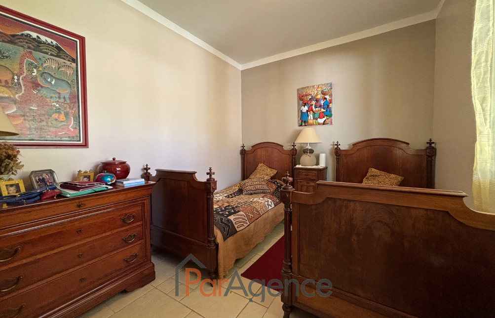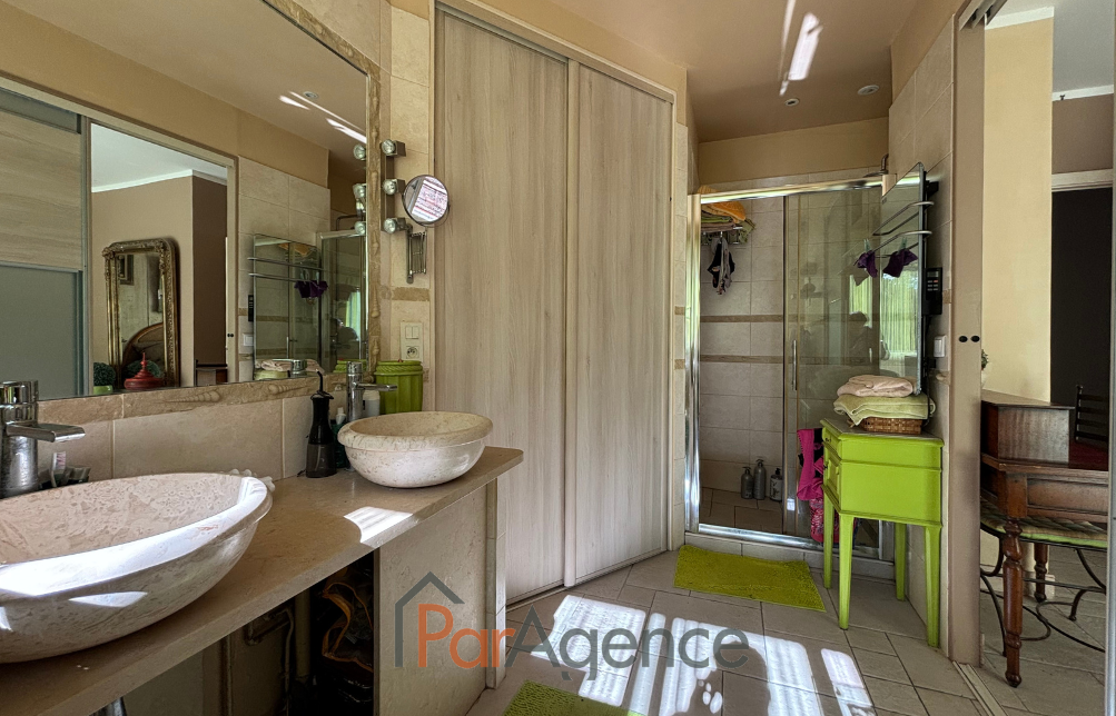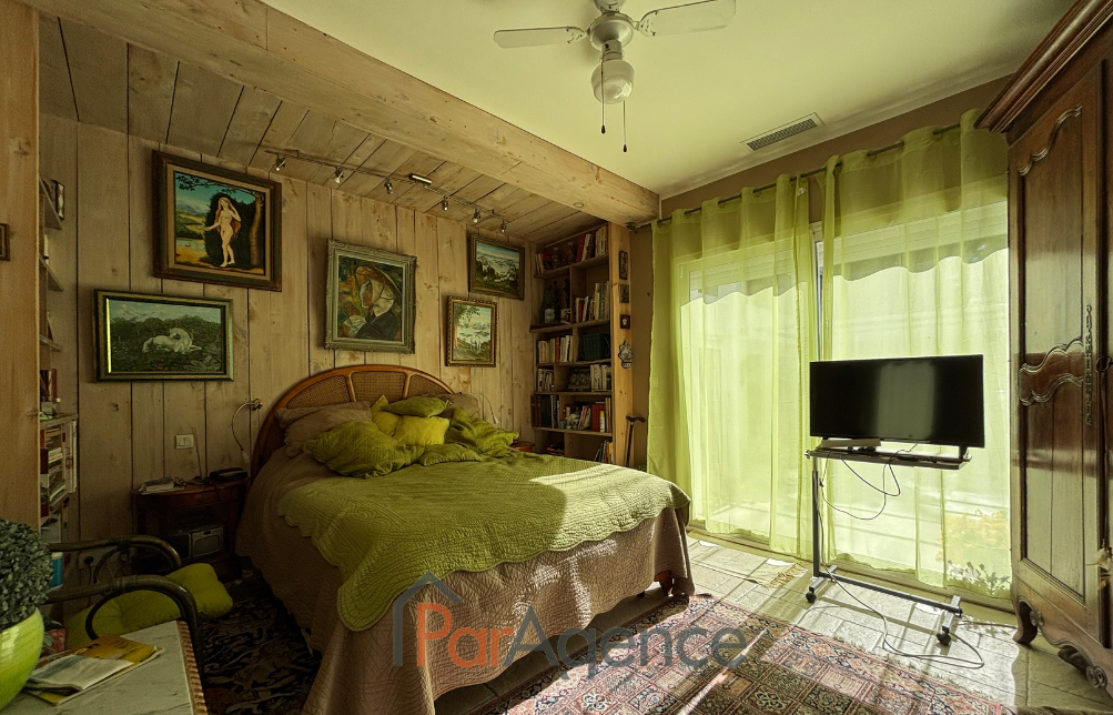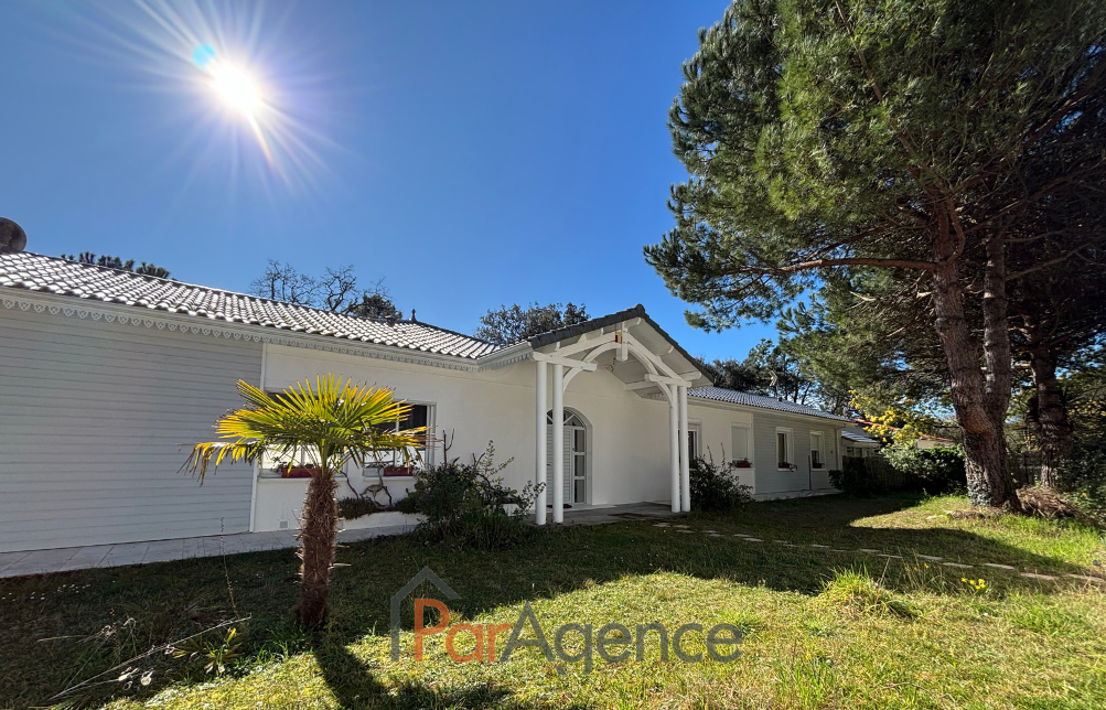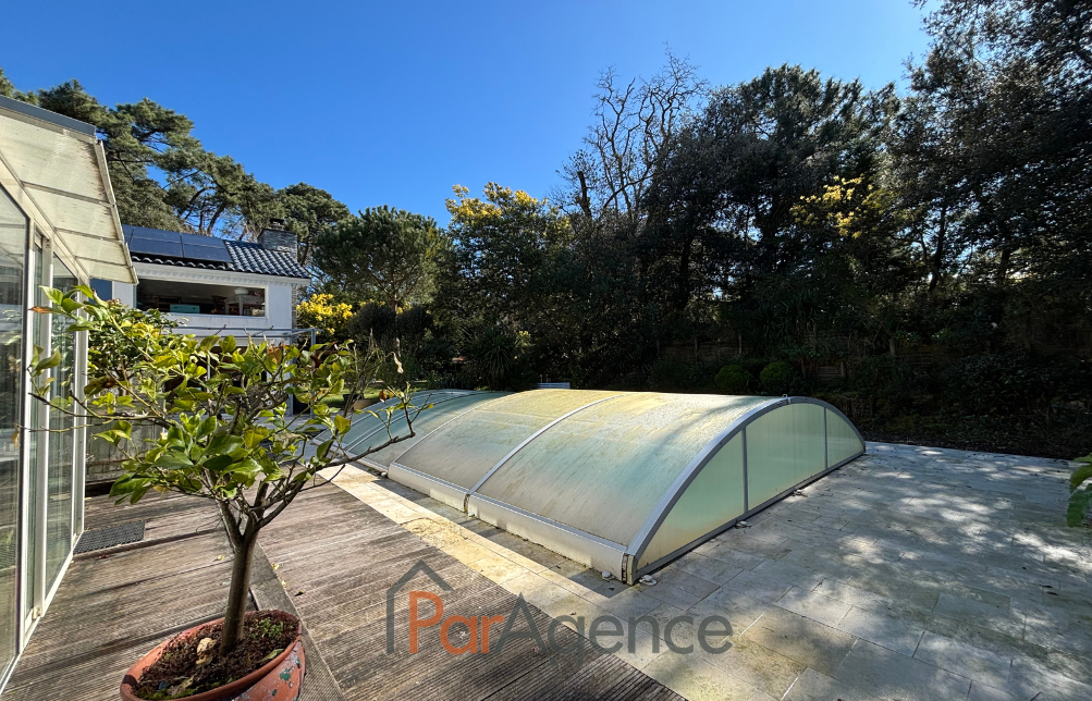 SAINT-PALAIS-SUR-MER A 450 m de la piste cyclable et 800 m de la plage de la Grande Côte, à proximité du GOLF, dans une résidence sécurisée, MAISON comprenant pour une surface habitable totale de 235 m² : Hall d'entrée, bureau, séjour cathédrale de 65,70 m² avec cuisine à l'américaine équipée et cheminée- insert, exposé sud-est et sud-ouest, donnant sur terrasse et PISCINE, dégagement desservant une chambre avec salle d'eau, w.c. et dressing, deux autres chambres avec salle d'eau, mezzanine, cellier et buanderie, w.c. avec lave-mains. Attenant, un appartement comprenant : séjour avec cuisine à l'américaine, surmonté d'une mezzanine mansardée, salon, une chambre avec salle d'eau et w.c. Pompe à chaleur air/air par climatisation réversible. Sous-sol de 90 m² accessible par monte charge. SPA et PISCINE 4x8 couverte.Abri de jardin et carport. Le tout sur une magnifique parcelle de terrain boisée et arborée, sans vis-à-vis de 2930 m². Les informations sur les risques auxquels ce bien est exposé sont disponibles sur le site Géorisques : www.georisques.gouv.fr. Honoraires agence à la charge du vendeur. https://www.par-agence.fr/nos-honoraires.