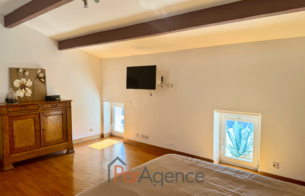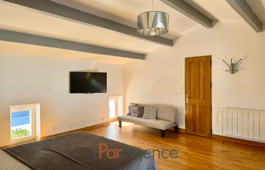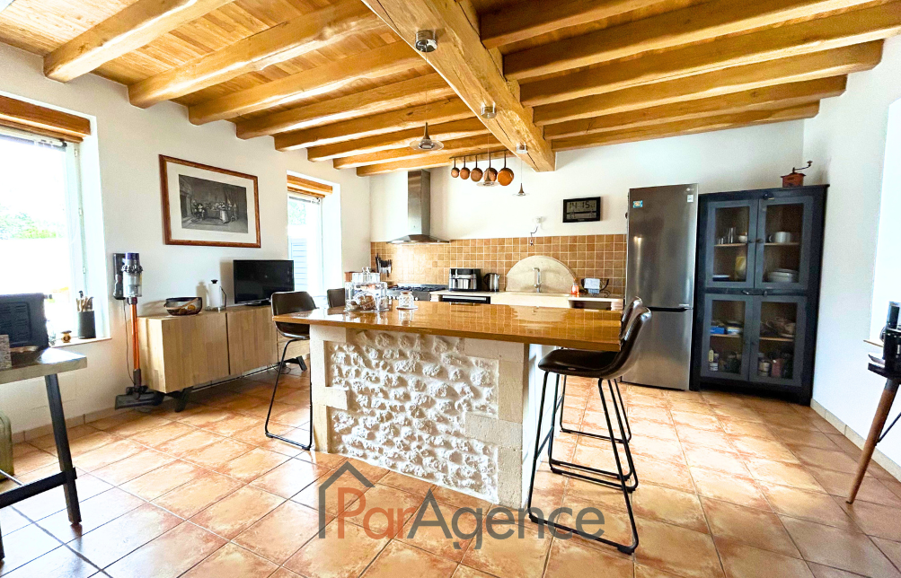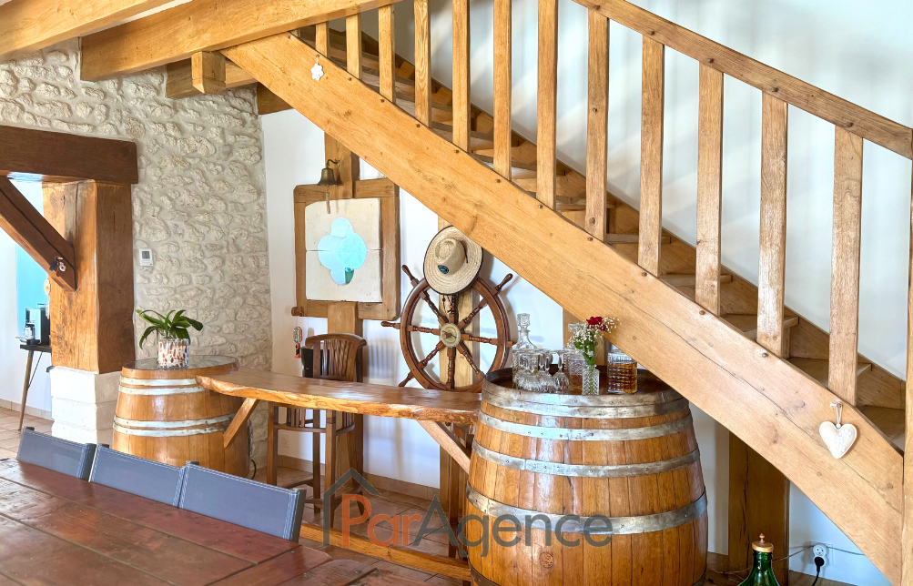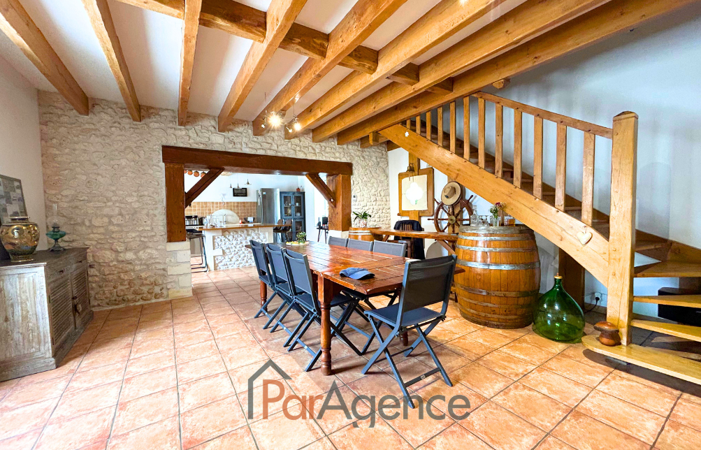 SAINT-PALAIS-SUR-MER A 1000 m de la plage du Platin et 1600 m du marché, Superbe Maison charentaise entièrement rénovée comprenant pour environ 189 m² habitables : Au rez-de-chaussée : entrée, salon avec cheminée, salle à manger et cuisine équipée, une chambre, salle d'eau avec w.c., cellier. A l'étage : palier, dégagement, trois chambres, salle d'eau avec w.c.Chauffage au sol électrique basse tension au rez-de-chaussée et radiateurs fonte aluminium à l'étage.En annexes : Un auvent de 18 m² avec bar et cave en sous-sol. Le tout sur un terrain de 791 m². Les informations sur les risques auxquels ce bien est exposé sont disponibles sur le site Géorisques : www.georisques.gouv.fr. Honoraires agence à la charge du vendeur. https://www.par-agence.fr/nos-honoraires. -