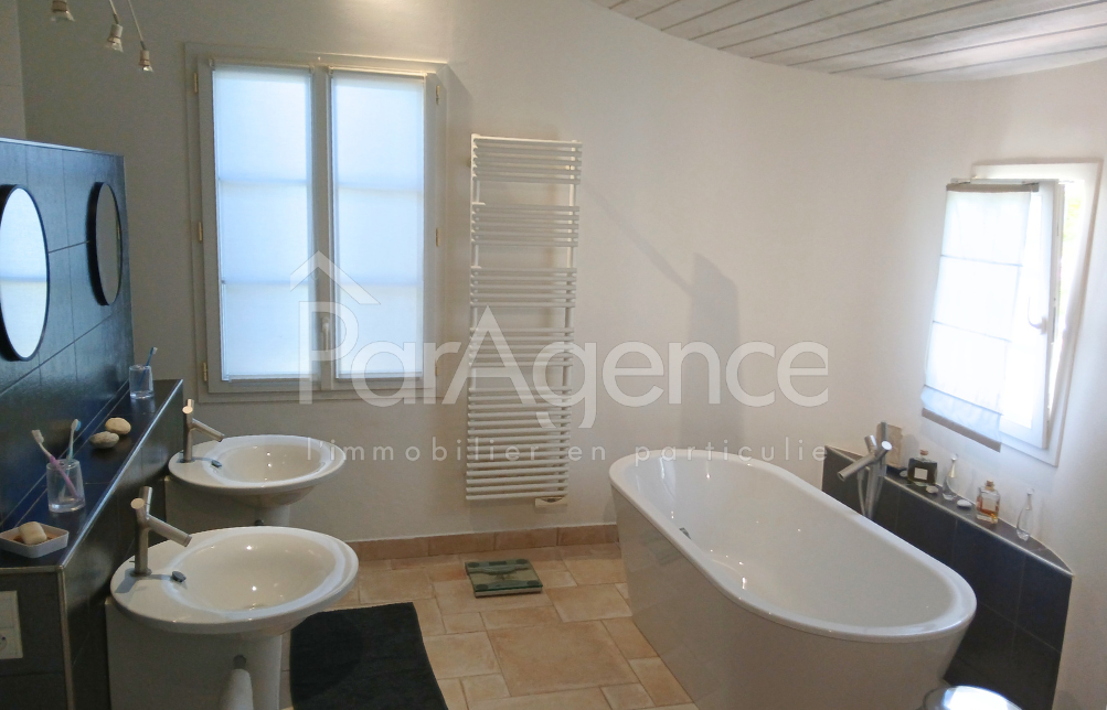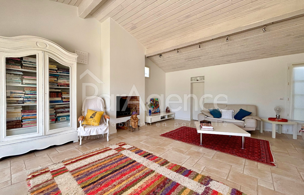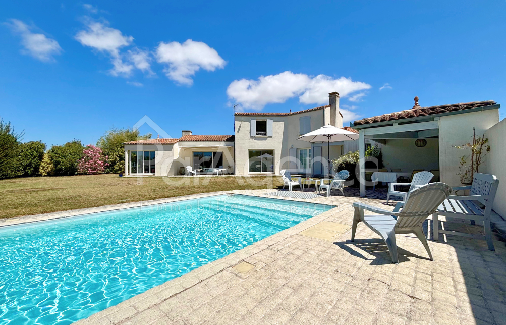 SAINT-SULPICE-DE-ROYAN à 5 kms du marché central de ROYAN dans un quartier calme, jolie maison d'architecte de 2005 comprenant 5 PP pour environ 204 m² habitables : Hall d'entrée avec placard, vaste salon avec cheminée et salle à manger attenante très lumineux ouvert sur terrasse et jardin, cuisine équipée ouvrant sur terrasse et jardin, suite parentale avec dressing et salle de bains avec baignoire et douche à l'italienne et wc. Une pièce ouvrant sur jardin, wc et lave-mains. Lingerie-chaufferie. Local technique piscine. A l'étage : Deux chambres dont une avec placard et grand rangement, salle d'eau avec wc éclairée par vélux. Chauffage par le sol pompe à chaleur au rez-de-chaussée et convecteurs électriques à l'étage. Un garage double de 42 m².Une cave climatisée. Piscine chauffée 9X4 m et Pool-house. Le tout sur un terrain clos et sans vis à vis de 1631 m². Les informations sur les risques auxquels ce bien est exposé sont disponibles sur le site Géorisques : www.georisques.gouv.fr. Honoraires agence à la charge du vendeur. https://www.par-agence.fr/nos-honoraires.