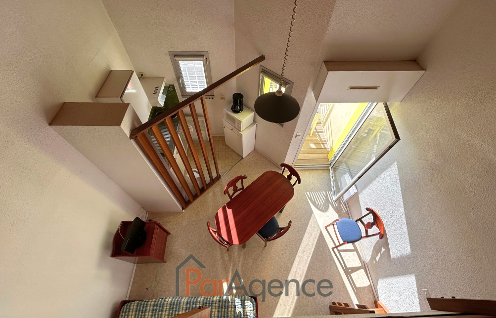 En exclusivité à Saint-Palais-sur-Mer, au sein d'un ensemble résidentiel recherché situé face à la plage du Bureau, cet appartement T2 en duplex offre un cadre de vie rare, à quelques pas du sable et des commerces du centre. Installé au premier et dernier étage du bâtiment C, il développe 34,54 m² habitables loi Carrez, pour 35,60 m² au sol, dans une atmosphère claire et fonctionnelle, idéale pour une résidence secondaire ou un pied-à-terre en bord de mer. L'entrée dessert un séjour lumineux ouvrant sur un balcon-terrasse de 5,40 m², véritable prolongement extérieur pour profiter de l'air marin. La cuisine attenante, dotée de fenêtres, bénéficie d'une lumière naturelle appréciable. Une salle d'eau avec WC complète ce niveau. À l'étage, la mezzanine très haute sous plafond accueille un espace nuit ou bureau, selon les usages, renforçant le caractère duplex et la sensation de volume. L'appartement est vendu meublé, prêt à être utilisé ou exploité. En option, il est possible d'acquérir un stationnement extérieur avec cave ou un garage, un vrai plus dans ce secteur très convoité. Visite virtuelle disponible sur demande. Honoraires d'agence à la charge du vendeur. En savoir plus sur nos honoraires : https://www.par-agence.fr/nos-honoraires/ Risques : www.georisques.gouv.fr